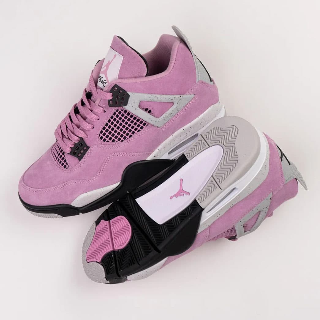 De Air Jordan 4 WMNS ‘Orchid’ heeft een roze upper gemaakt van suède. Het design gebruikt grijze details, zoals het embleem op de hiel en de Wings bij de veters. Zwarte veterogen contrasteren mooi met de roze upper, evenals de zwarte buitenzool. Op de tong is het Jumpman logo geplaatst. Deze verschijnt ook op de hiel en op de middenzool.