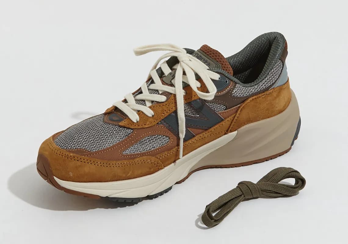 De sneaker heeft een basis van grijs mesh en wordt aangevuld met donkerdere grijze accenten op de hiel, een deel van de tussenzool en de ‘N’-logo’s aan beide zijden van de schoen. Daarnaast zijn er drie verschillende tinten bruin gebruikt voor de overlays, waarbij leer en suède elkaar aanvullen.