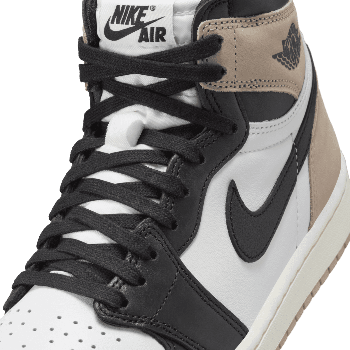 De volgende sneaker uit de Jordan lijn is de Air Jordan 1 High OG ‘Latte’. De sneaker verschijnt in de welbekende ‘Black-toe’ samenstelling. Het bovenwerk is van wit leer. Over de upper zijn zwarte en lichtbruine overlays geplaatst die de sneaker een strakke look geven. Op de hiel is het Wing logo geplaatst.