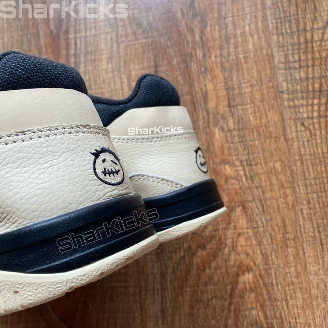 De golvende middenzool combineert de kleuren zwart en gebroken wit. Op de hiel is het welbekende Cactus Jack element geplaatst. Op de buitenzool is ‘JACK’ geschreven, wat hint naar het label Cactus Jack.