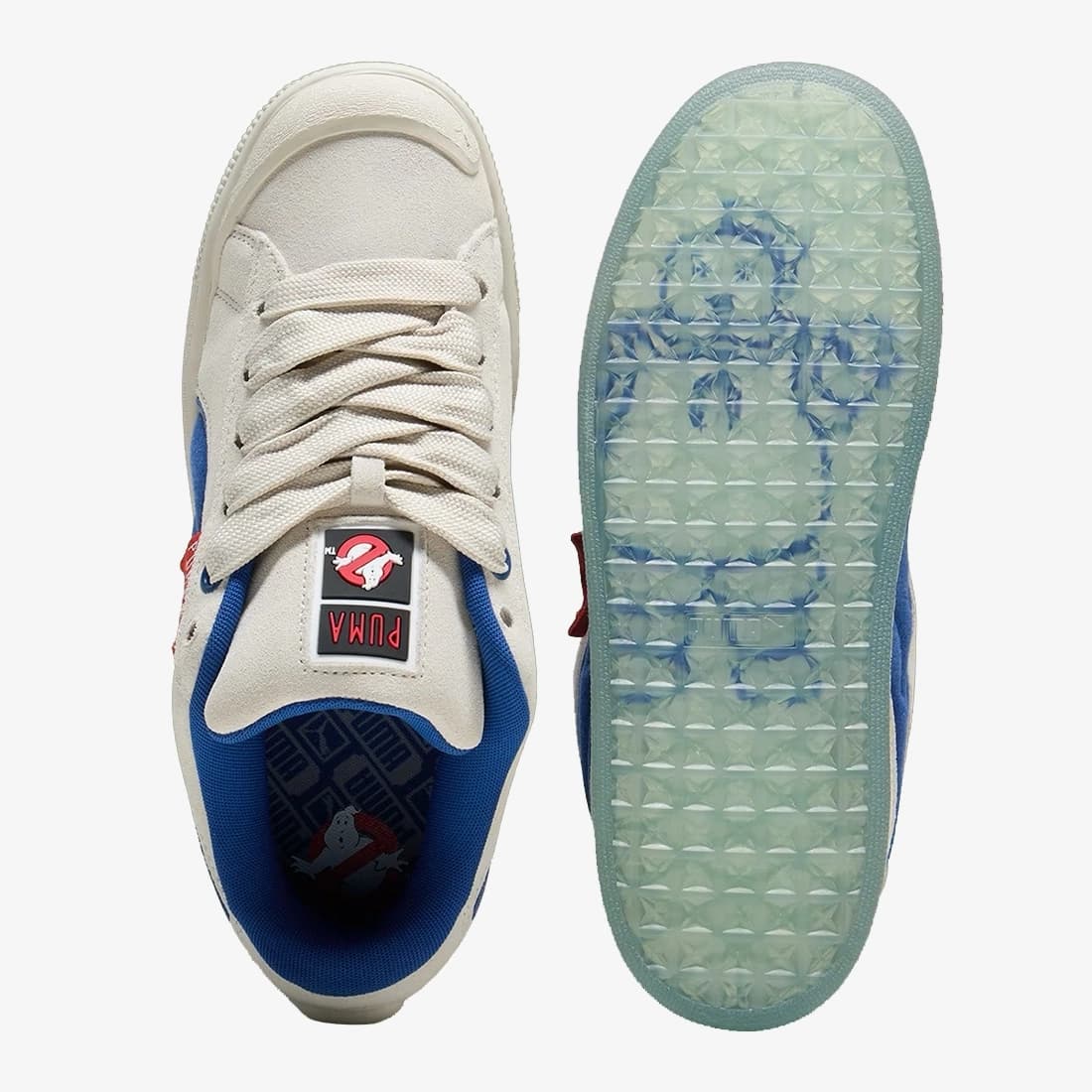 De ‘Stay Puffed’ colorway heeft een ietwat meer ingetogen look. De sneaker haalt inspiratie uit een ander prominent figuur uit de film: de Stay Puft Marshmallow Man die de stad overneemt. De sneaker heeft een witte upper, gemaakt van zacht suède. Rode en blauwe details op de tong en op het middenpaneel hinten naar de Marshmallow Man.