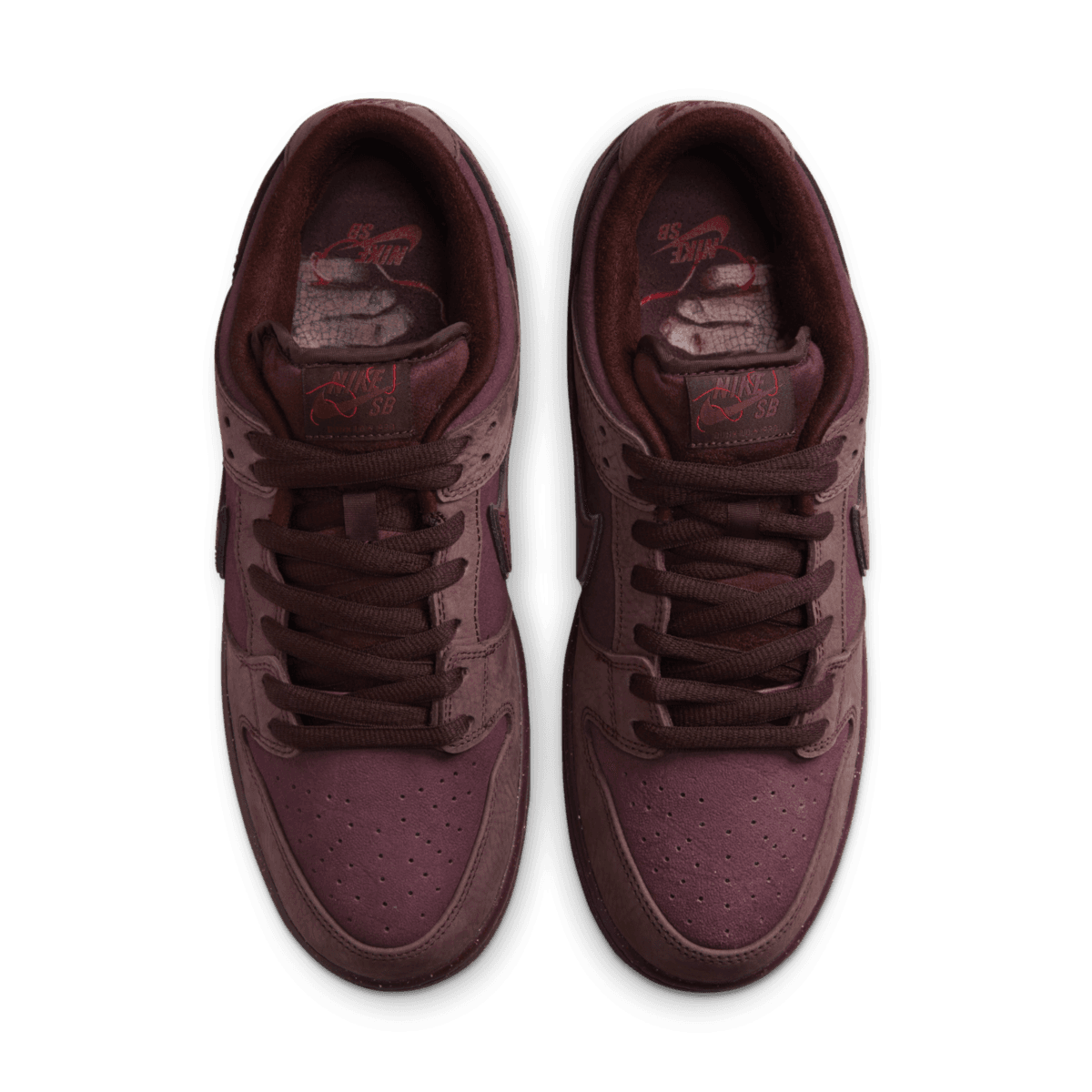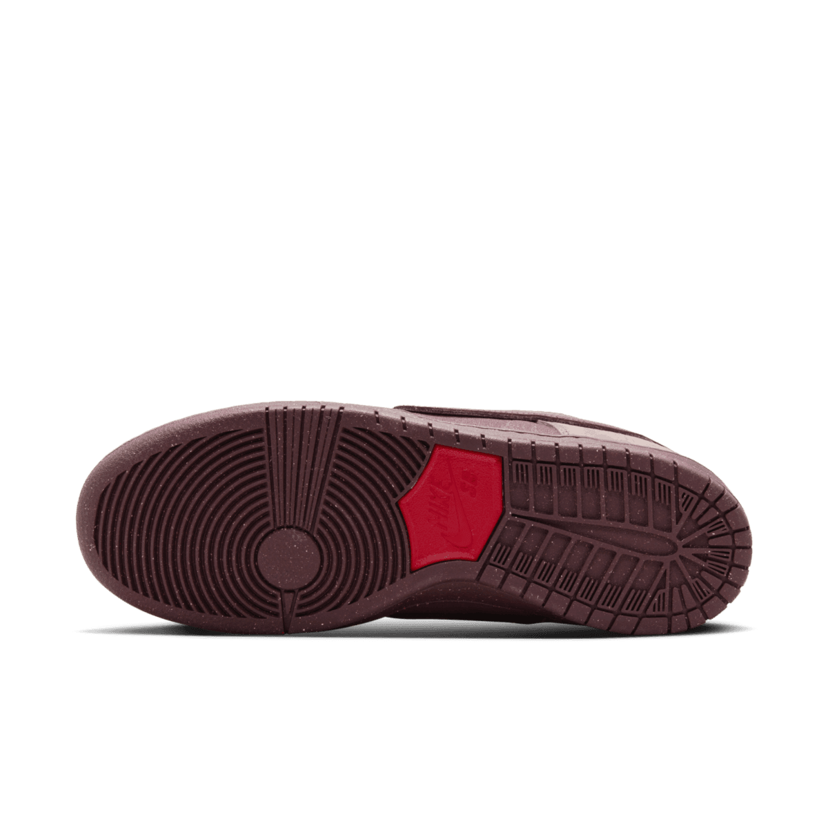 Het tweede paar uit het pack is de ‘Burgundy Crush’, een sneaker met een wat opvallendere colorway. Het paar kleurt van top tot teen dieprood, en gebruikt dezelfde materialen, maar vervangt het satijn van de ‘Coconut Milk’ met stevig suède. Klassieke Nike brandings verschijnen op de tong, hiel en op het middenpaneel.