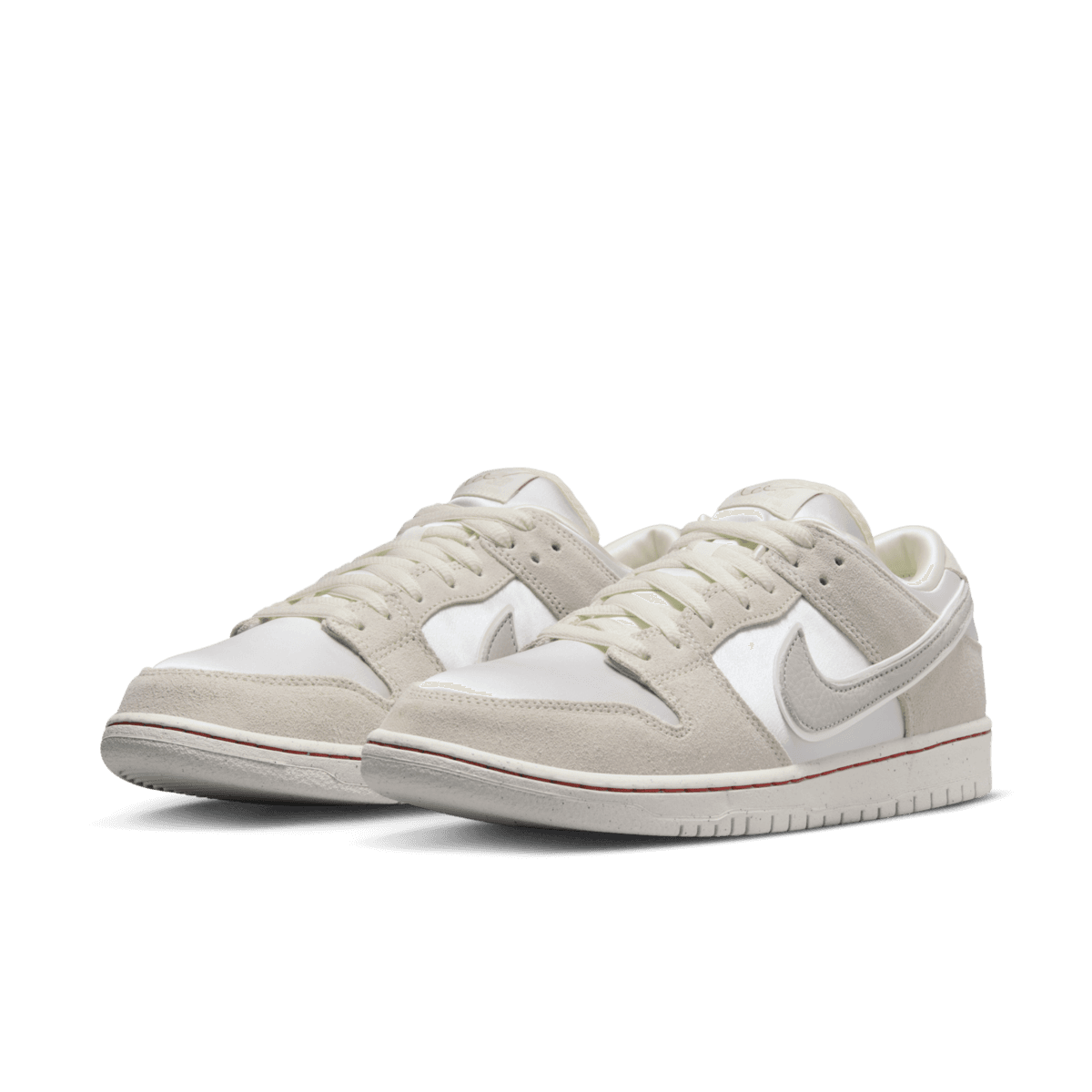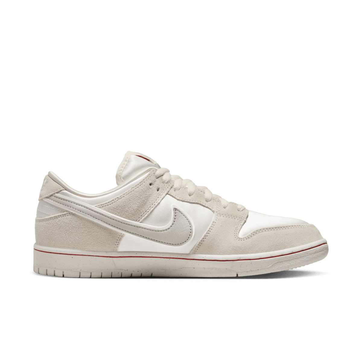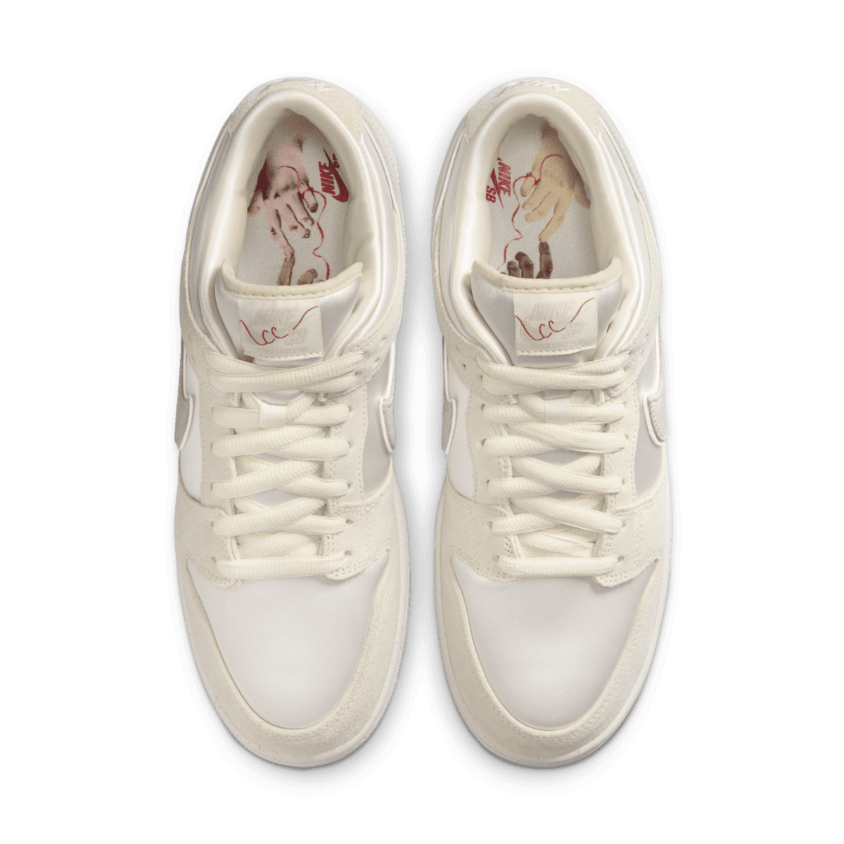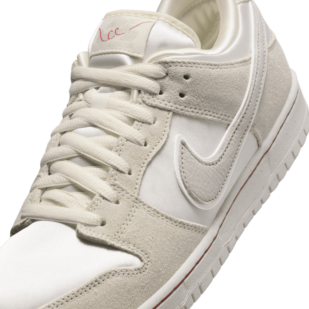 Dit brengt ons dan ook bij de volgende release: het Nike SB Dunk Low ‘City of Love’ pack, bestaande uit twee colorways. De ‘Coconut Milk’ heeft een ingetogen colorway. Het bovenwerk combineert de materialen satijn, leer en suède in beigetinten. De kleur rood verschijnt op de middenzool.