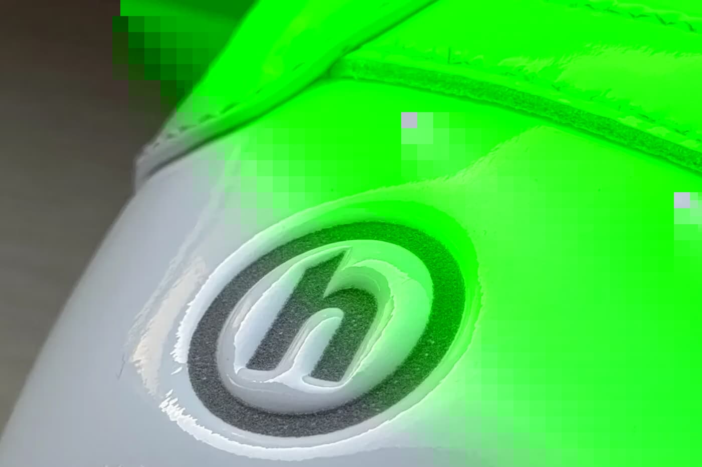 Het eerste beeld toont een gedetailleerde close-up van de hiel, waarop HIDDEN’s kenmerkende omcirkelde “h”-logo is ingeprent in strak wit lakleer. Hoewel velen aanvankelijk dachten dat het om een Air Force 1-release ging, een sneaker die HIDDEN.NY al eerder heeft gebruikt in zijn projecten, waren er oplettende kijkers die de afgeronde vorm van de hiel direct wisten te linken aan BAPE.