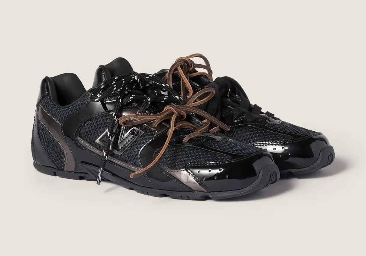 Voor Fall 2025 brengt Miu Miu de New Balance 530 dichter bij het standaardmodel met drie mesh stijlen, het materiaal dat ook op het reguliere design veel gebruikt wordt. Het paradepaardje van de collectie is een volledig zwarte variant met lakleer en bruine touwveters.