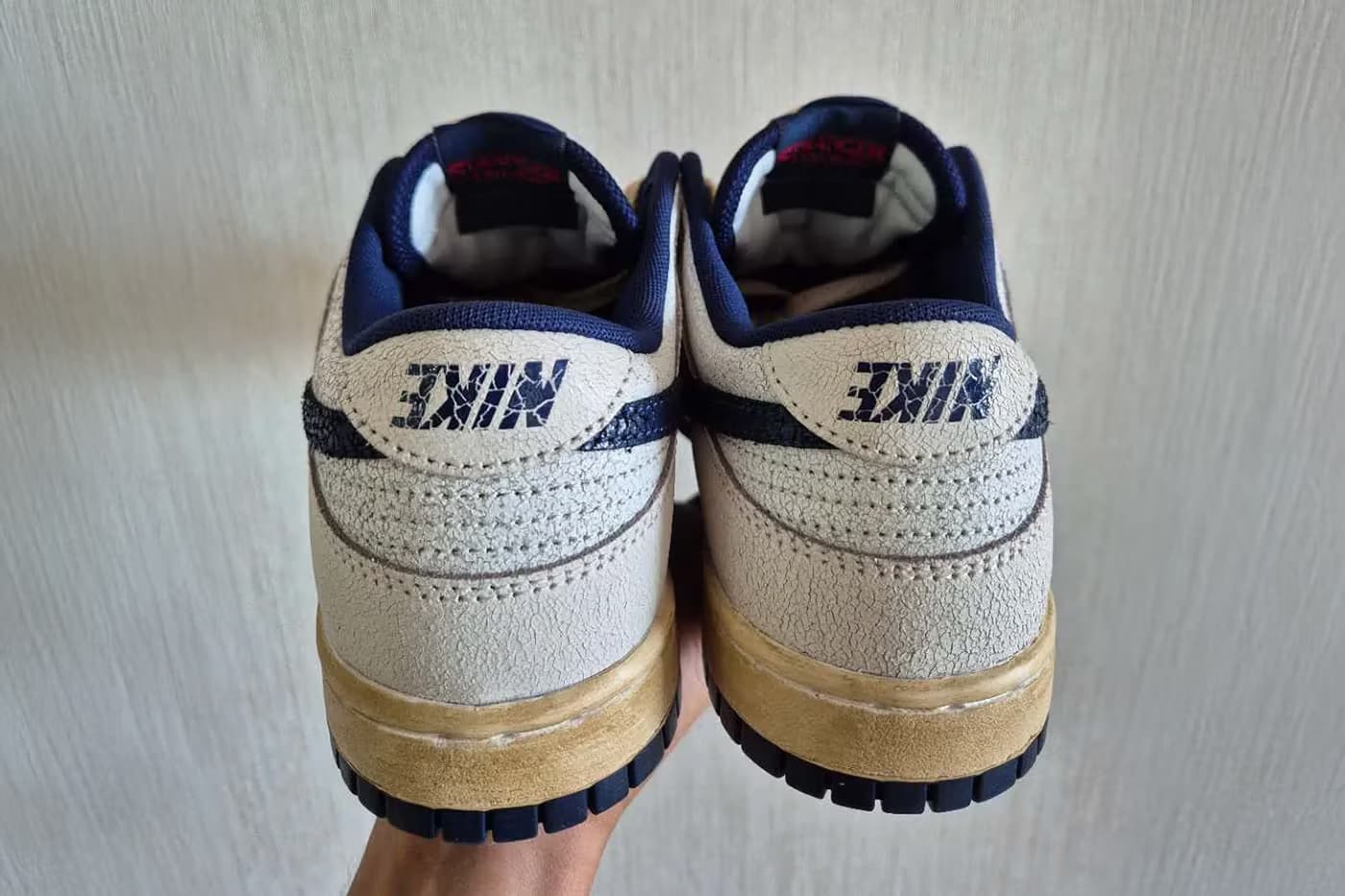 Zoals we eerder al zagen, heeft de sneaker een bovenwerk van gebarsten leer en omgekeerde Nike logo’s op de tong, binnenzool en hiel, een subtiele verwijzing naar de duistere Upside Down-dimensie uit de serie.