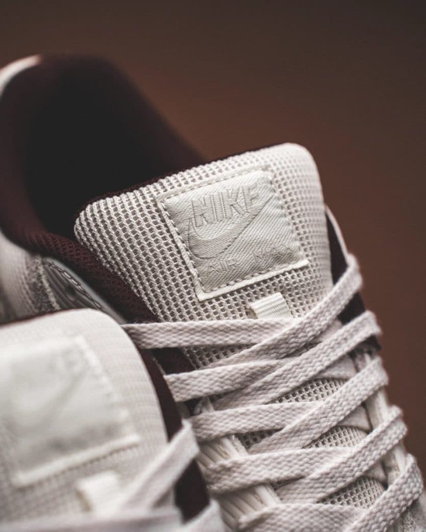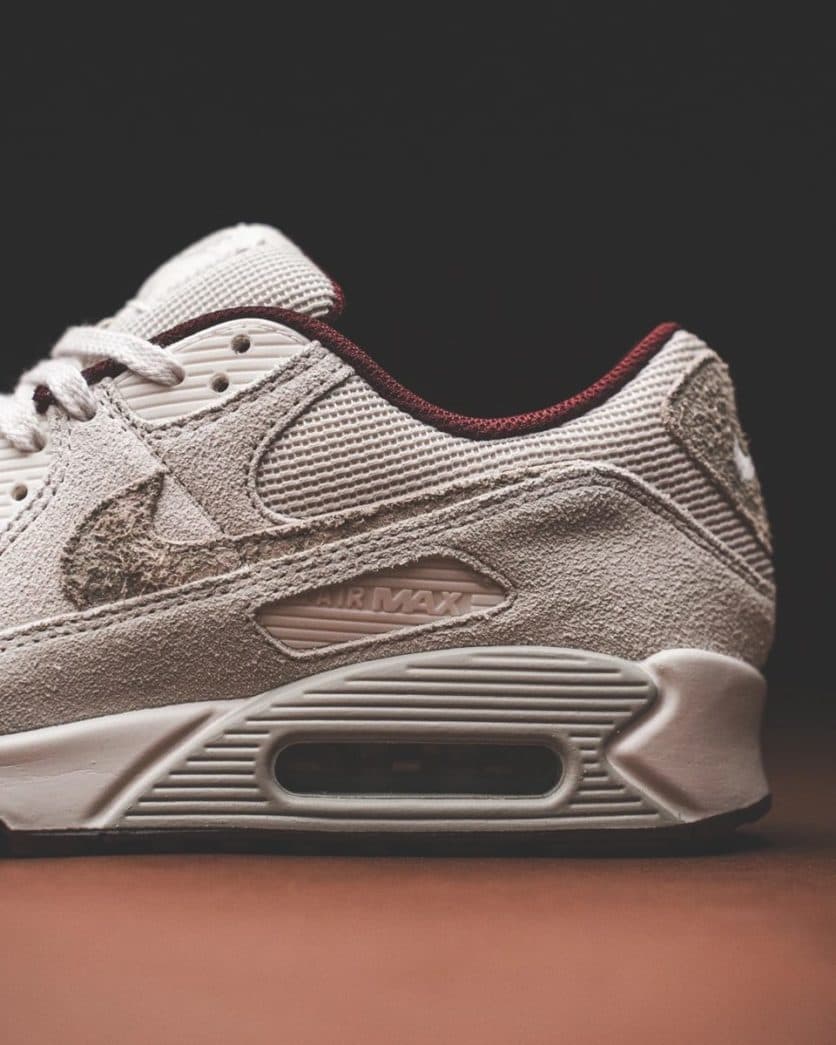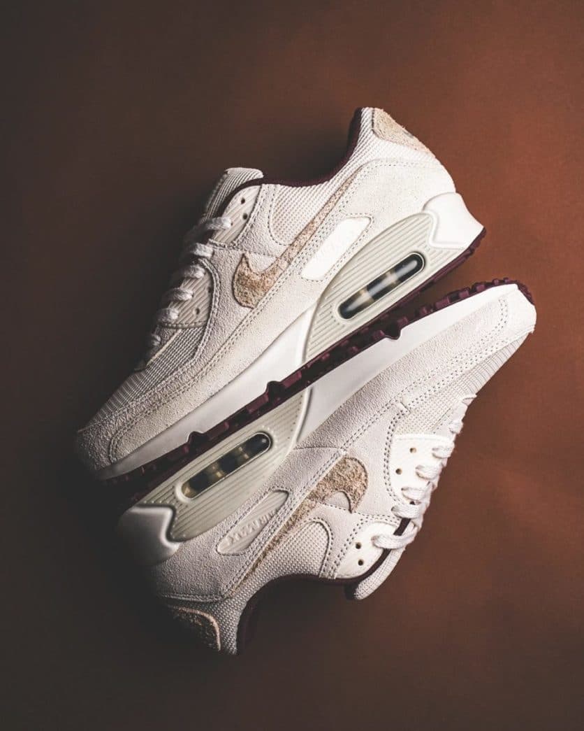 De ‘Burgundy Crush’ colorway gebruikt een ingetogen kleurenpalet die de kleuren beige en bordeaux mixt. Het bovenwerk is gemaakt van suède, canvas en leer. De Air Max 90 gebruikt rode details in de kraag en op de buitenzool. Het bovenwerk is gemaakt van textiel. Suède en synthetische overlays zorgen voor een gelaagde look.